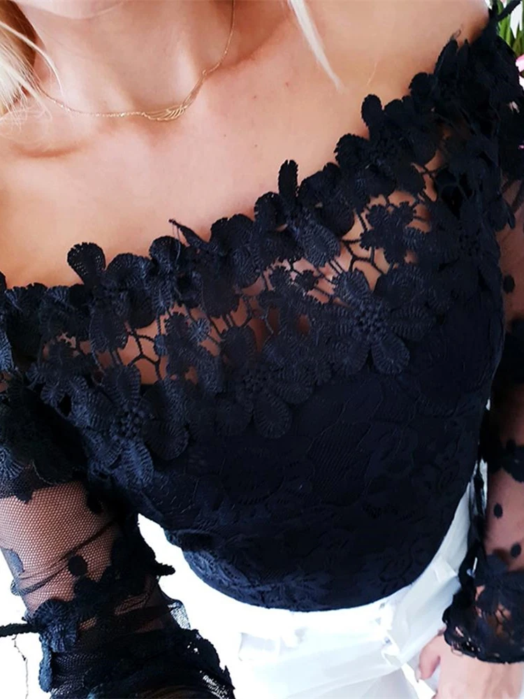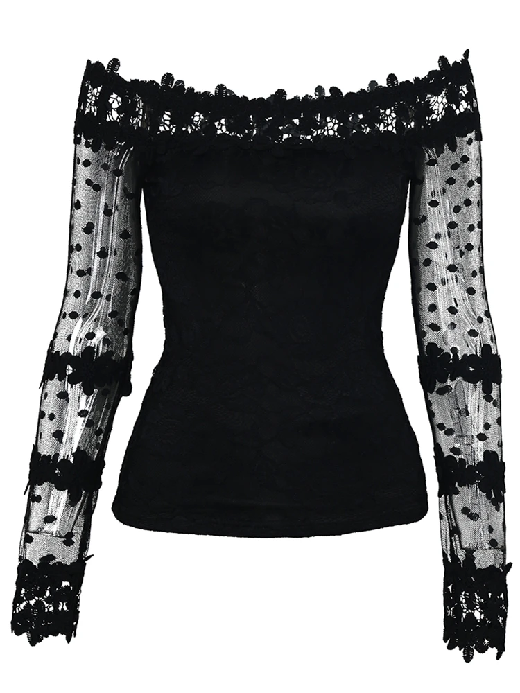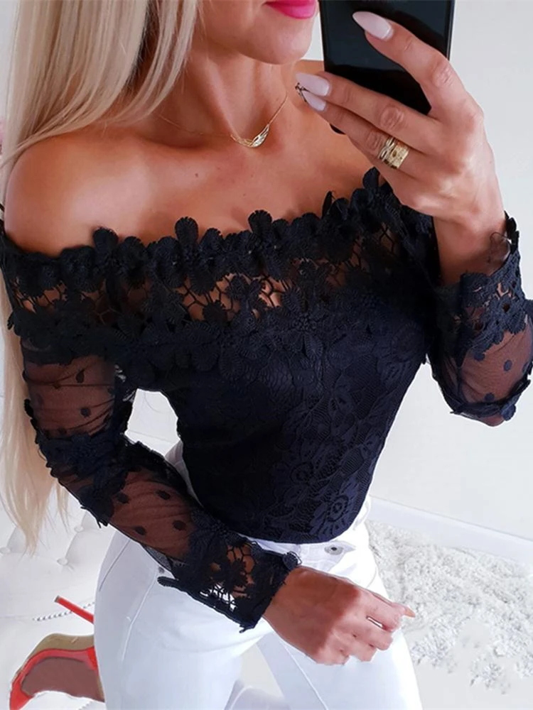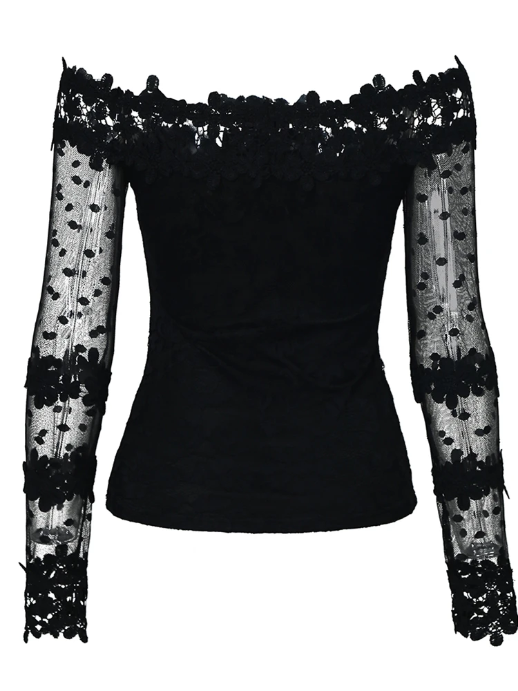 Best 2020 Autumn Women Elegant Black Mesh Leisure Shirt Female Stylish Sexy Basic Top Off Shoulder Mesh