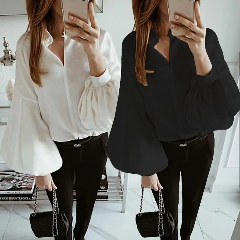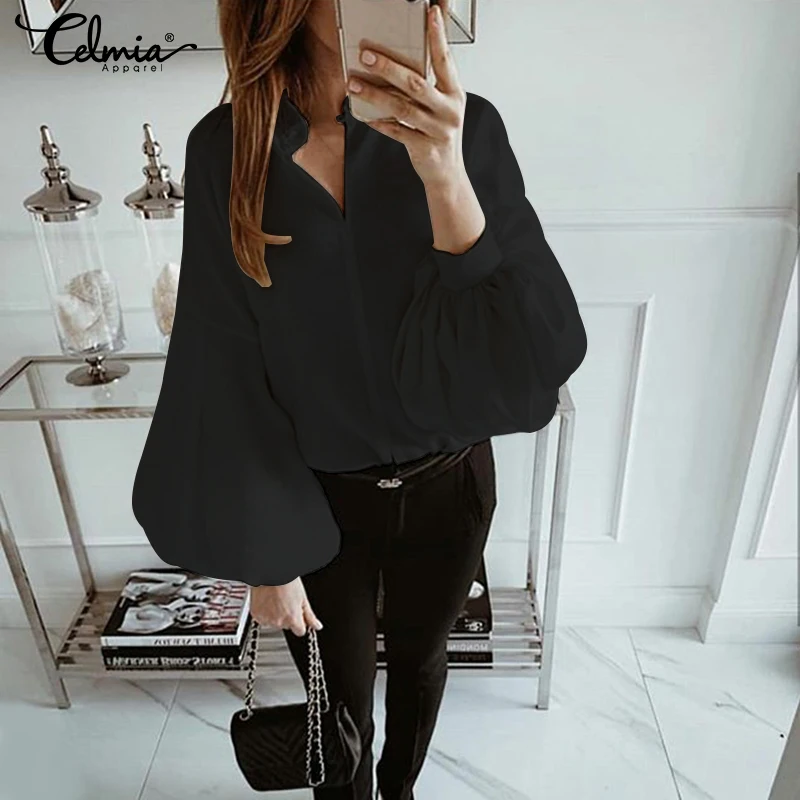 Promo Celmia Plus Size Chic Women Casual Loose Blouse Long Lantern Sleeve Office Tops Female Solid Sexy V