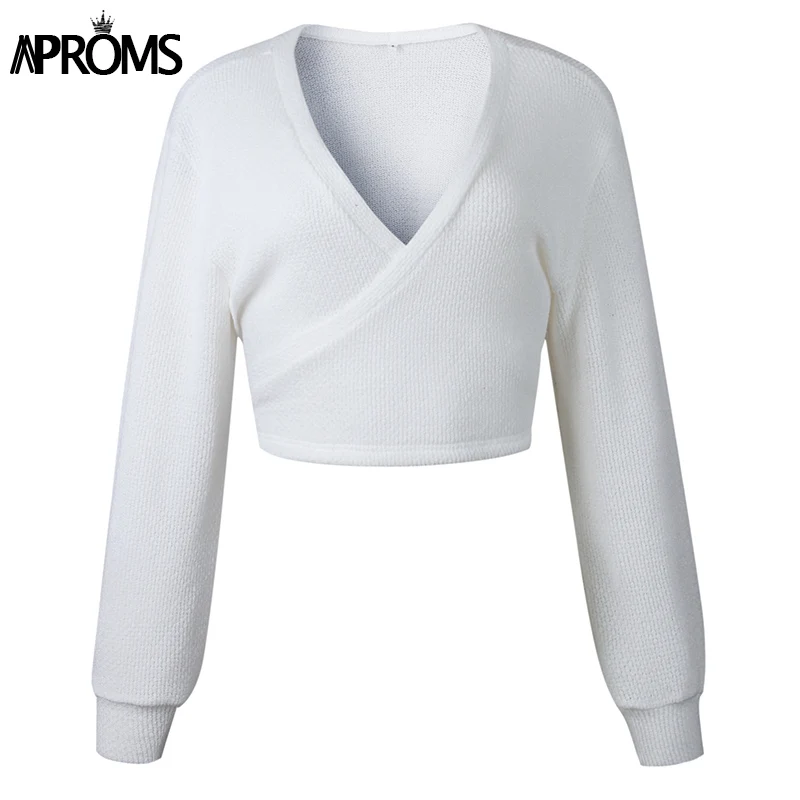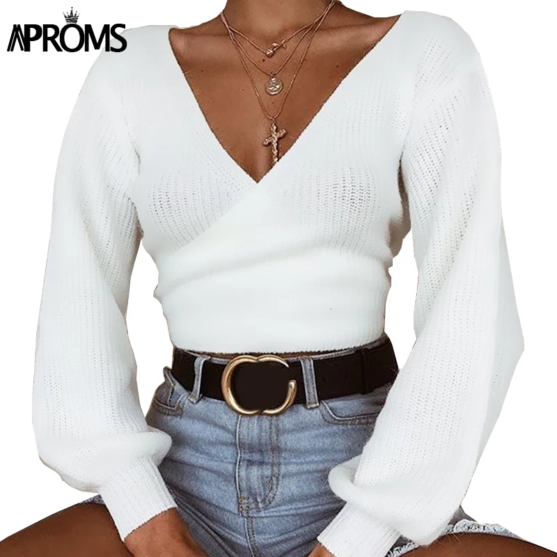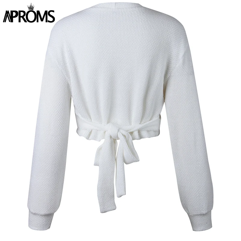 Buy Aproms Deep V Neck White Wrap Knit Pullover Women Autumn Bow Tie Knitted Cropped Sweater Female Win