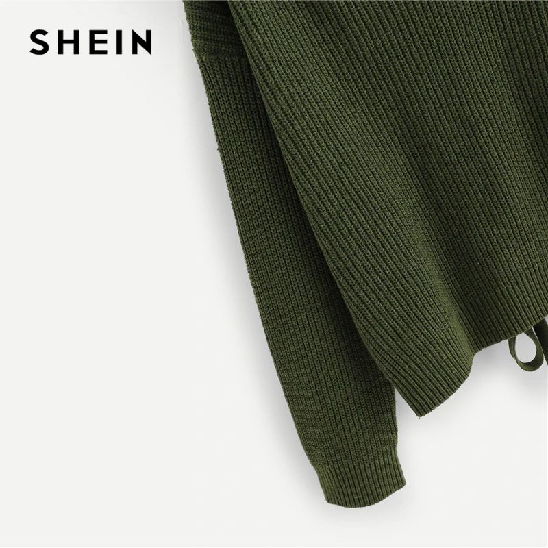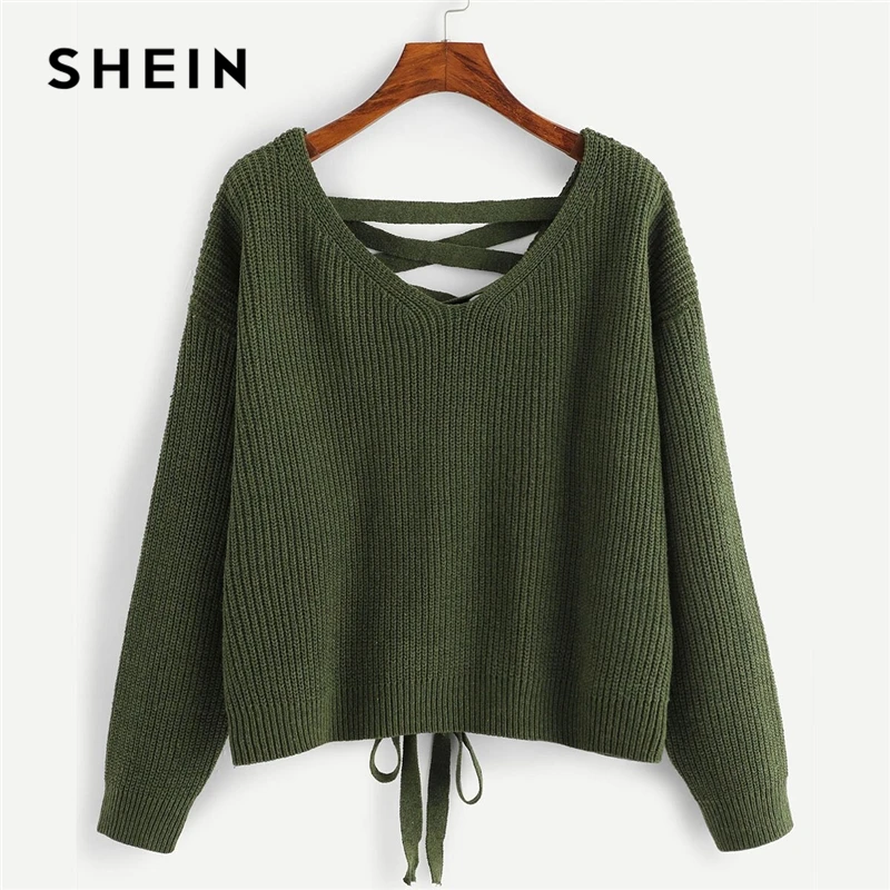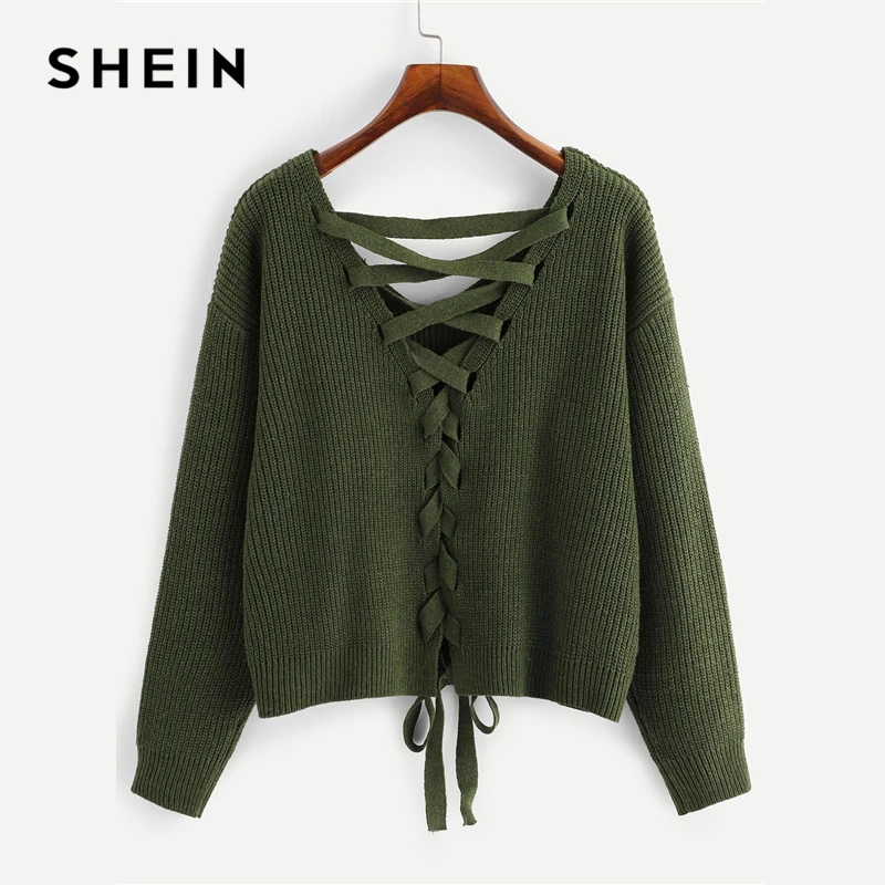 Best SHEIN Army Green Lace Up Back Drop Shoulder Sweater Pullover Women Autumn Winter Long Sleeve V Neck
