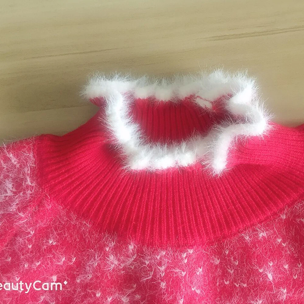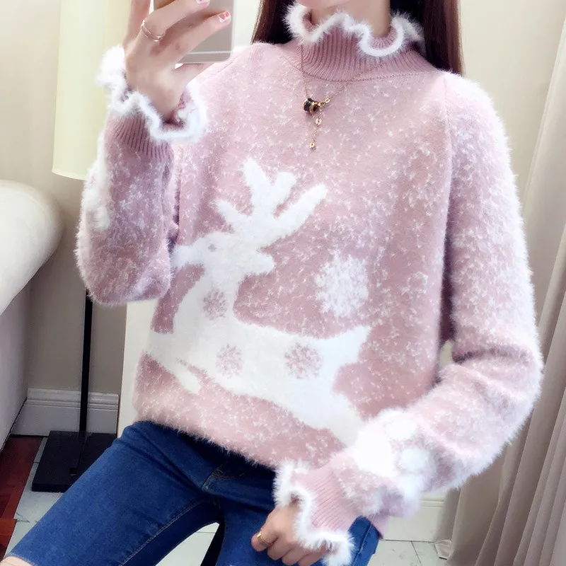 Promo Christmas Sweater Red Women Jumper Winter Girl Pullover knitted Plush collar Soft Mohair Pink Elk p
