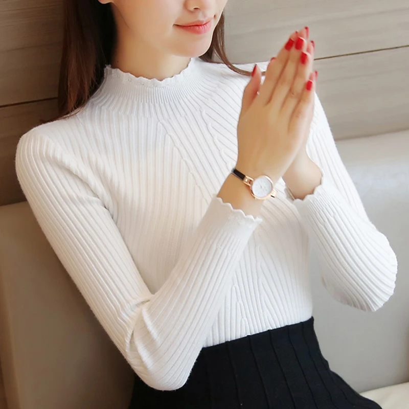 Promo Solid Knitted Ruffle Sweater Women Winter Sexy Slim Elegant Pullover Sweater Ladies Korean Casual L