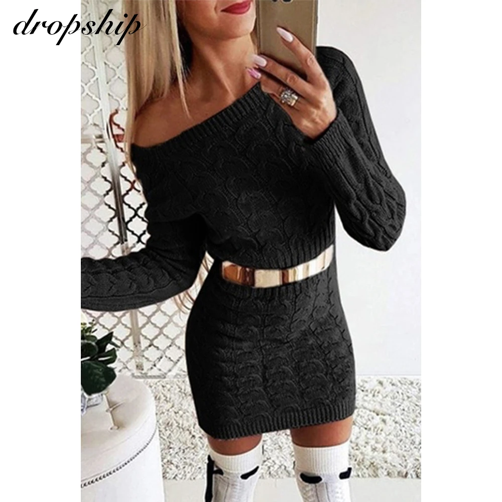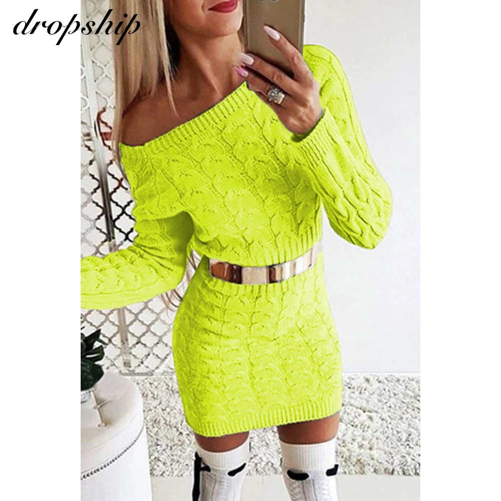 Promo Winter White Sweater Dress 2019 Knitted Sweaters Women Autumn Slash Neck Female Pink Sexy Solid Lad